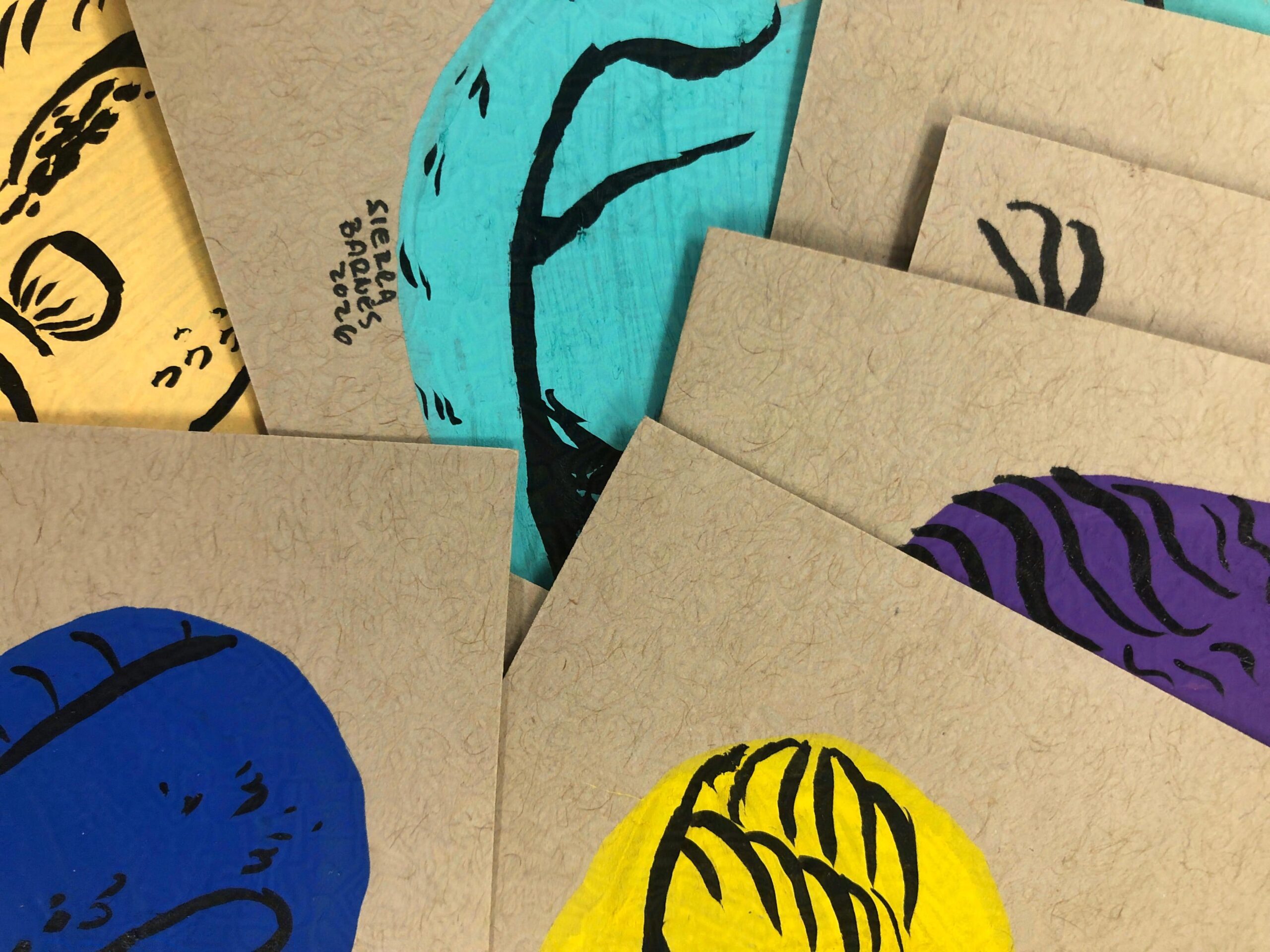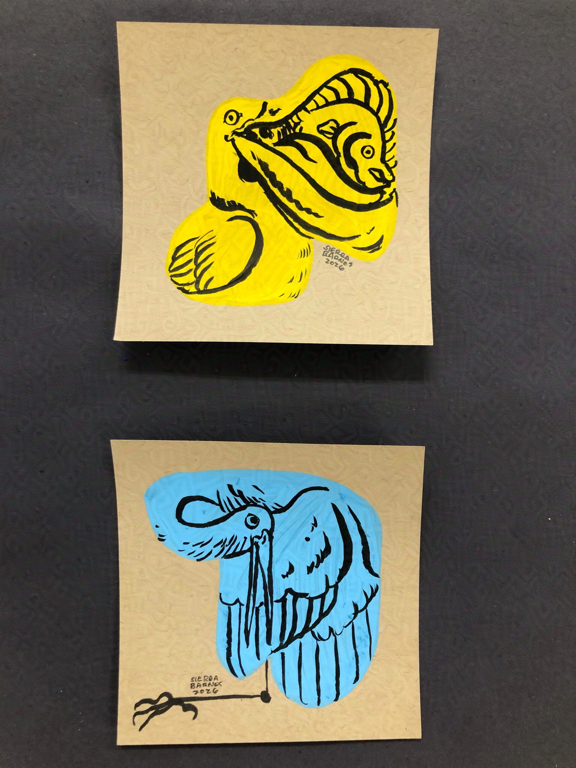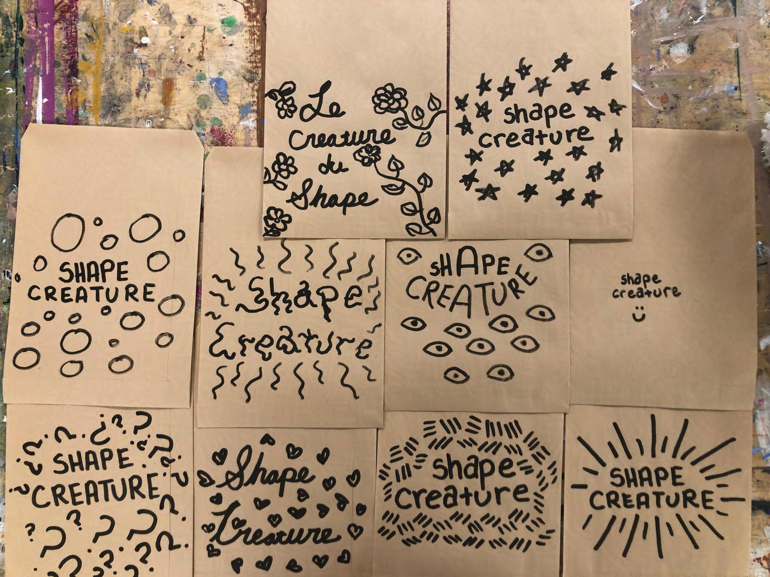 Each drawing was done by first painting a random blob with posca pens, and then the creature was formed afterward with brushpen based on the form the blob suggested. Each bag contains one of ten 4×4” pieces of original artwork.