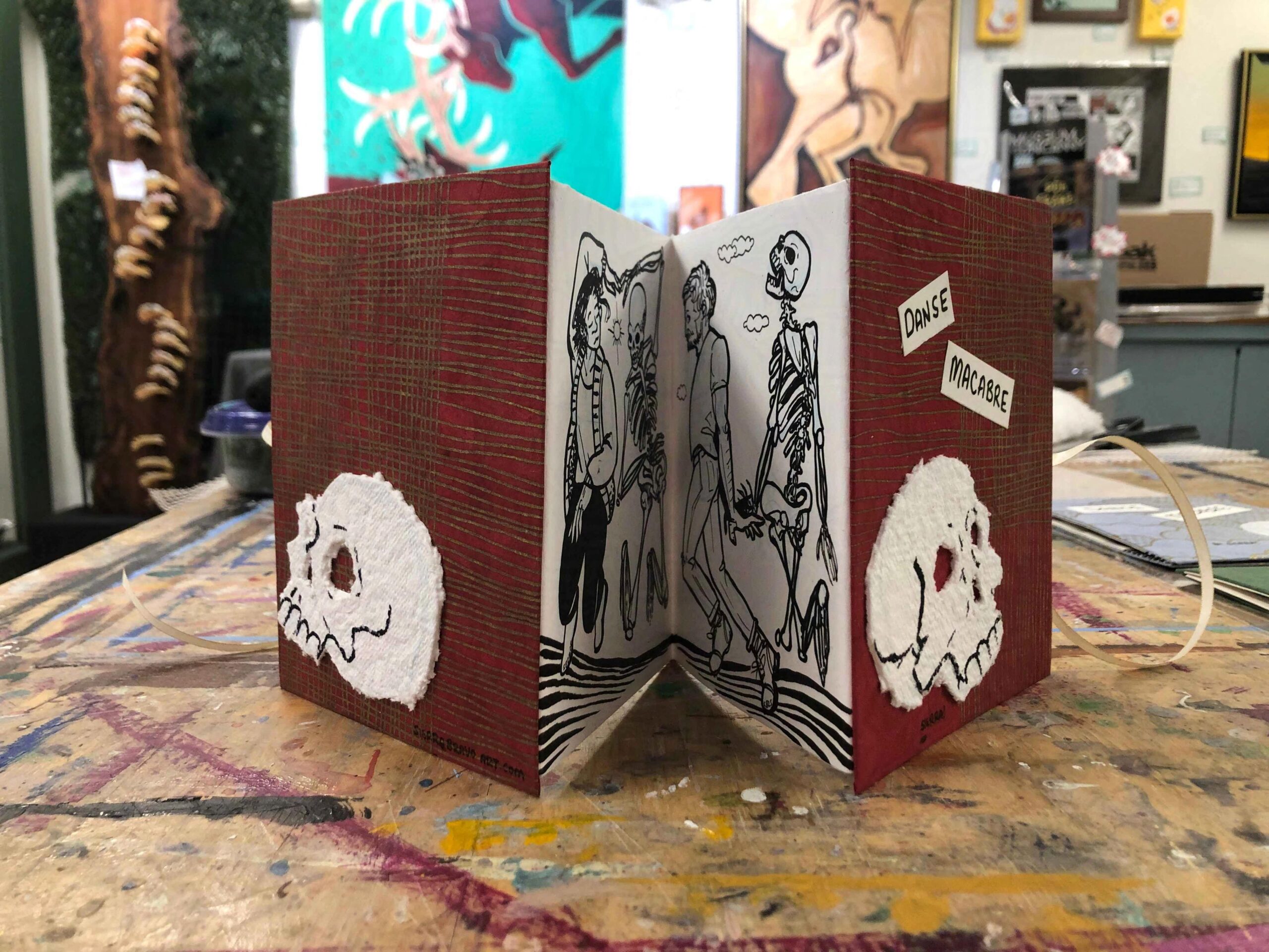 Following the long artistic tradition of the Danse Macabre, this little accordion book features five original pen-and-ink illustrations of skeletons dancing hand-in-hand with living people, as well as a hand-bound cover, and twin decorative skulls on the front and back cover made from handmade paper all done by yours truly. Every part of this is handmade and one-of-a-kind!