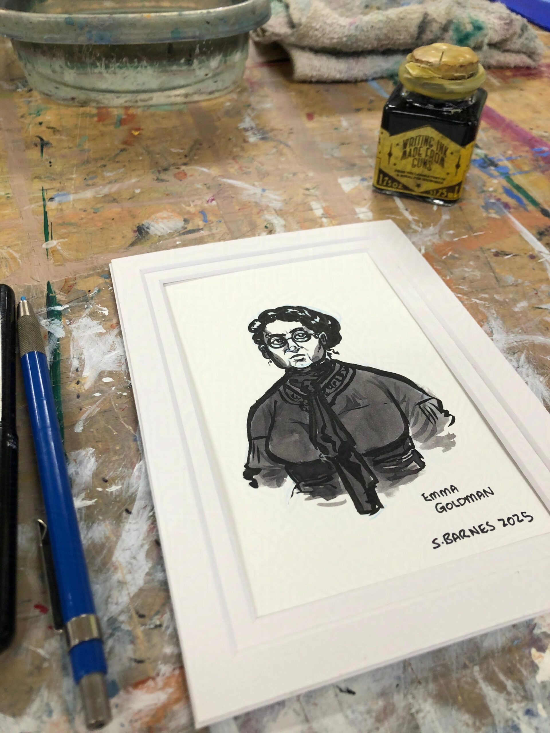 I recently found the work of artist Thomas Little aka A Rural Pen, who makes writing ink from dissolved guns, and was instantly in love. I knew I had to grab a bottle, and to kick off using this gorgeous grey-purple, I did portraits of three people whose work I also admire. Emma Goldman was a Kaunas-born (then in the Russian Empire, now in Lithuania) anarchist, activist, and revolutionary active in the United States and, after being deported in 1919 for her political beliefs, across Europe and Canada. She was a prolific writer on many topics, including socialism, the new Soviet Union, feminism, homosexuality, prison and the military, voting rights, and atheism, and her groundbreaking observations on gender and politics are still influential today.