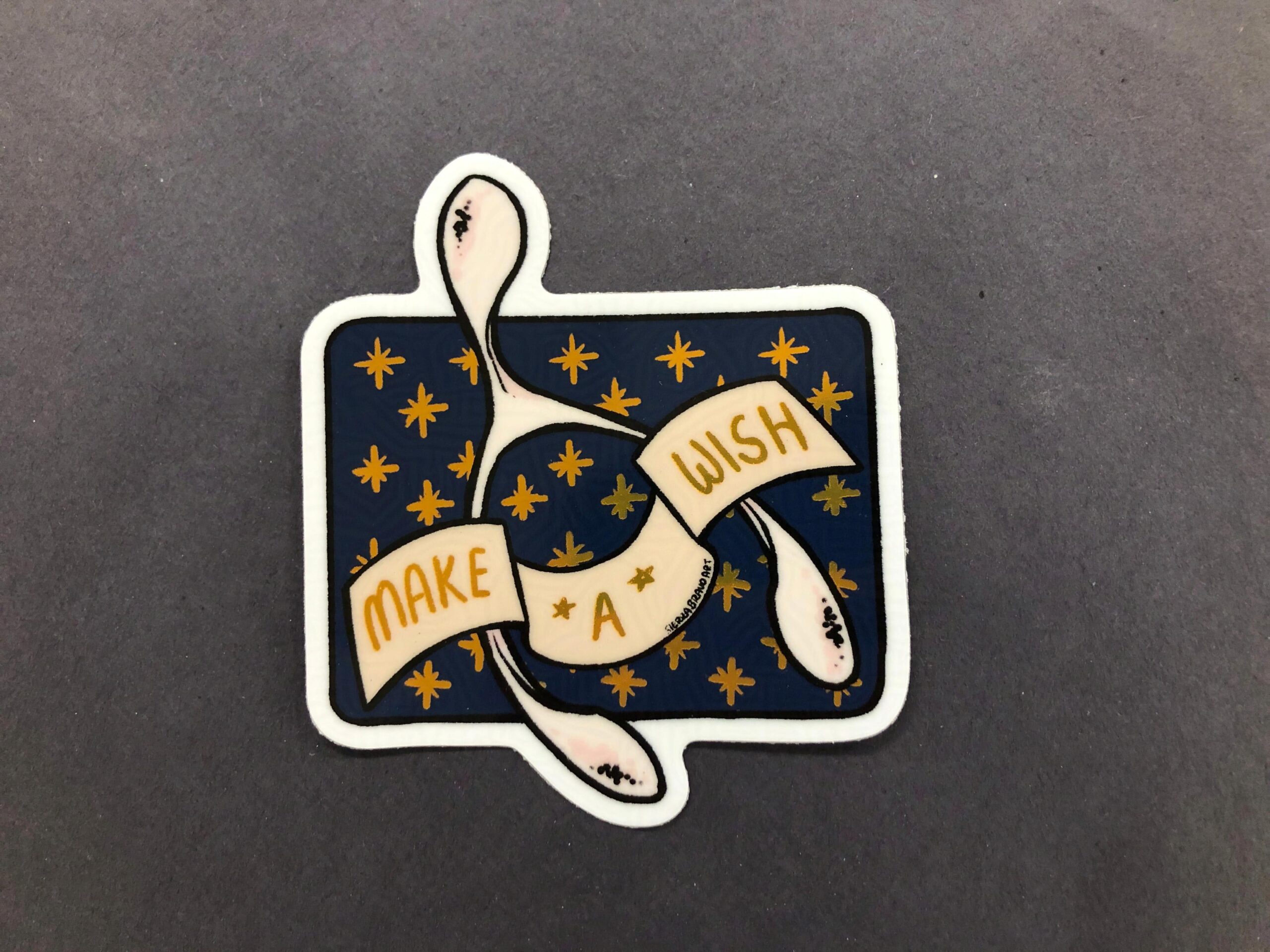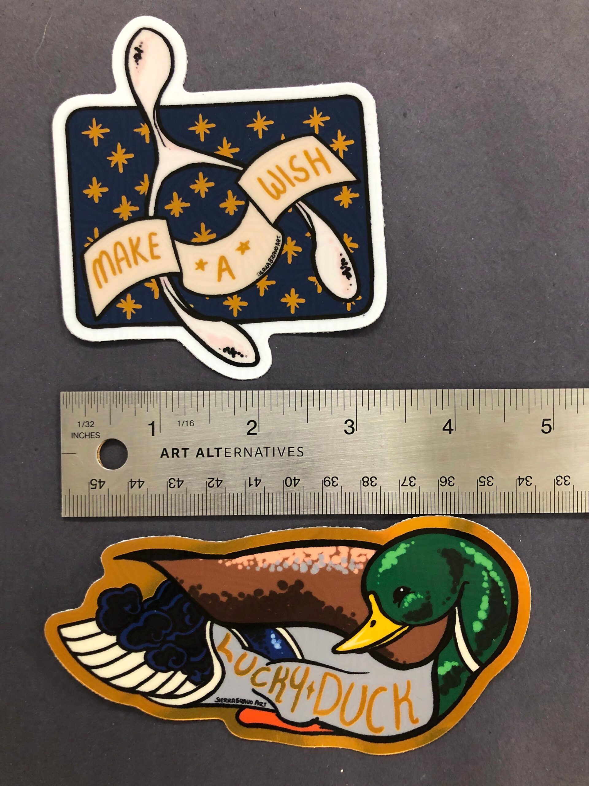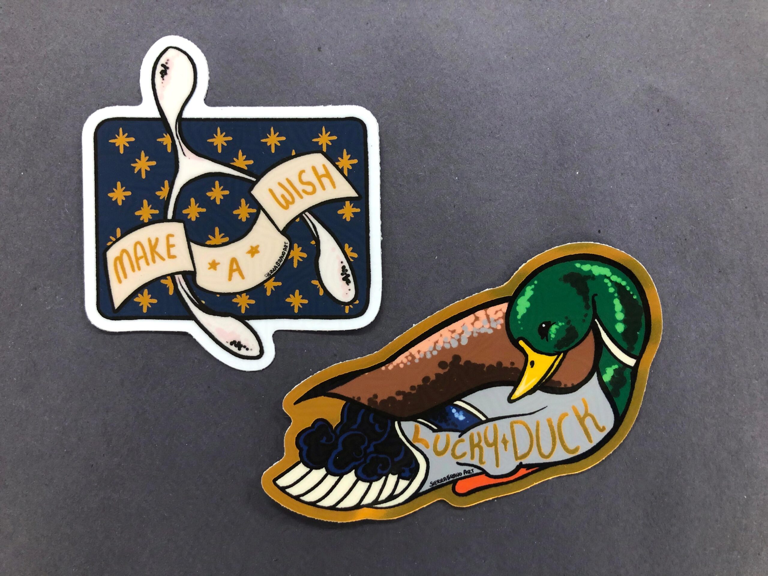Two stickers designed for a good-luck set earlier in the year, featuring a Lucky Duck and a Wishbone! Each sticker features gold chrome features and is vinyl protected, meaning it’s safe for notebooks, water bottles, the back of your car, and more! Will it bring you good luck? I sure hope so.